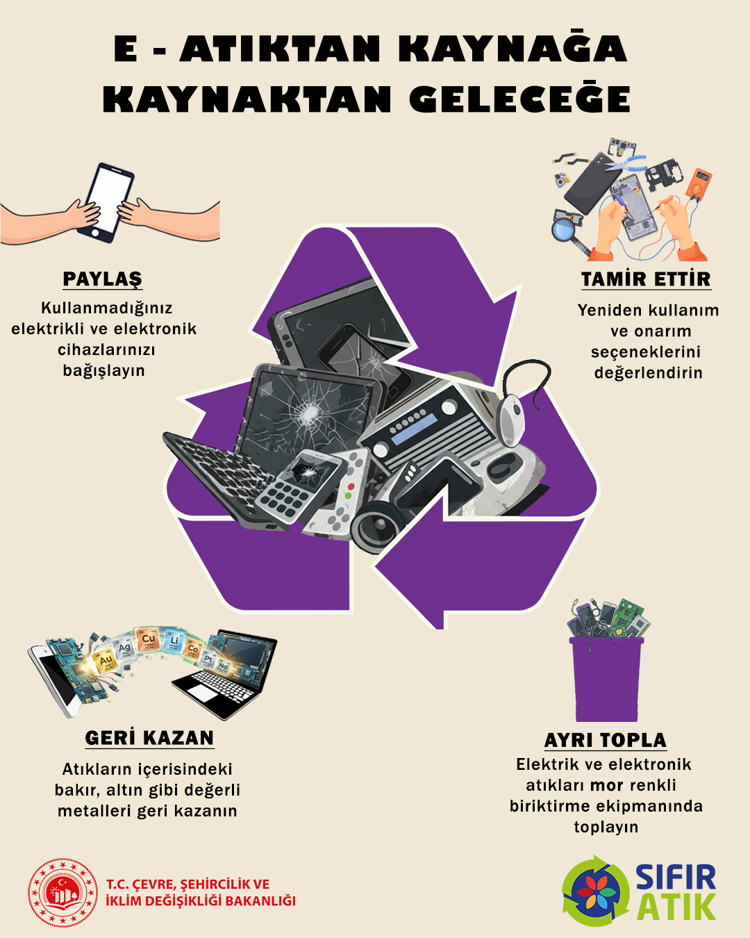 2026 yılında uygulanacak Sıfır Atık temaları kapsamında Şubat ayı, “Elektrik-Elektronik ve Metal Atıklar” ayı olarak belirlenmiştir. Bu kapsamda yayımlanan farkındalık materyalleriyle; kullanım ömrünü tamamlayan elektrik-elektronik eşyalar ve metal atıkların doğru şekilde ayrıştırılmasının, tamir edilerek yeniden kullanımının ve geri dönüşüm süreçlerine kazandırılmasının önemi vurgulanmaktadır.